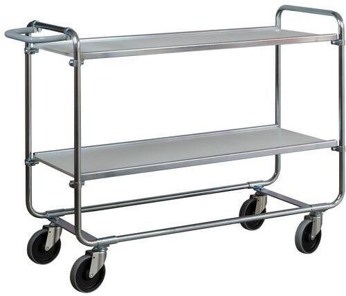 Polcos kocsik két polccal, alkalmasak irodákba iratlefűzők, ívek és más irodai kellékek szállítására. A polcok tetszés szerinti magasságba állíthatók vagy teljesen kivehetők a kocsiból. A 25 mm magas polcél megakadályozza a tárgyak kiesését a kocsiból, a lemez szürke laminálással borított. A kezelést a felhasználó szüksége szerint dönthető fogantyú könnyíti meg. A kocsi mozgását négy csúszó csapágyas forgó görgő biztosítja. A görgők futófelülete nem szennyező gumiból készül. Felületkezelése horganyzással.