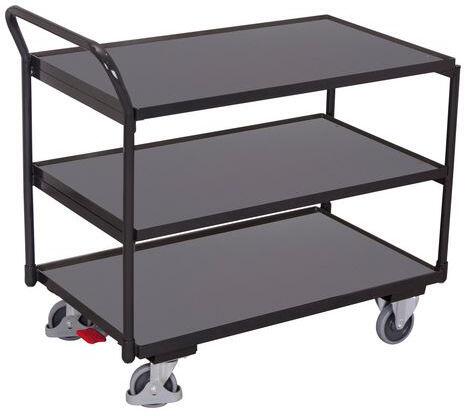 Stabil kocsik három polccal, alkalmasak anyagok és tárgyak raktári szállítására. Az MDF lapból készült polcok 12 mm-es élű fém kocsikeretbe vannak beállítva. A mozgást négy gördülő golyóscsapágyas kerék biztosítja, melyek közül kettő fix, kettő pedig Easy Stop fékekkel és védőburkolatokkal forgatható.